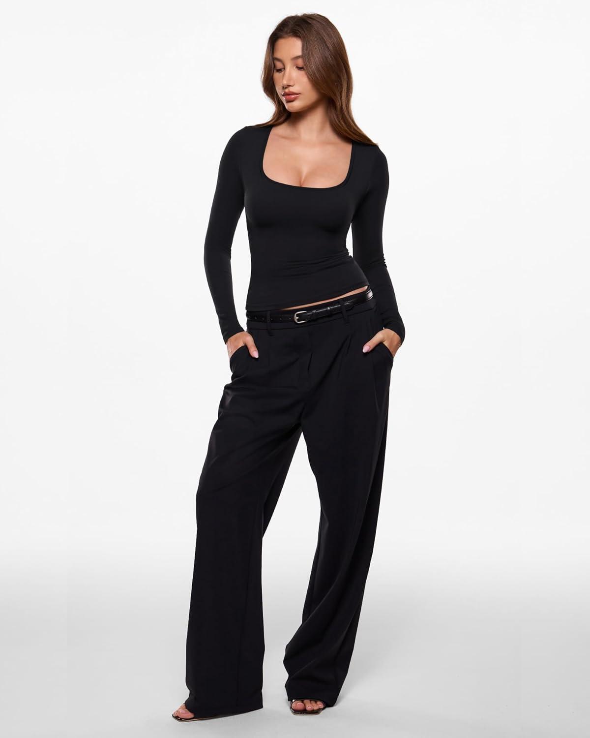 INLYRIC Women's Airsoft Single Layer Long Sleeve T-Shirts Square Neck Basic Tees Slim Fitted Going Out Tops Trendy(Black)