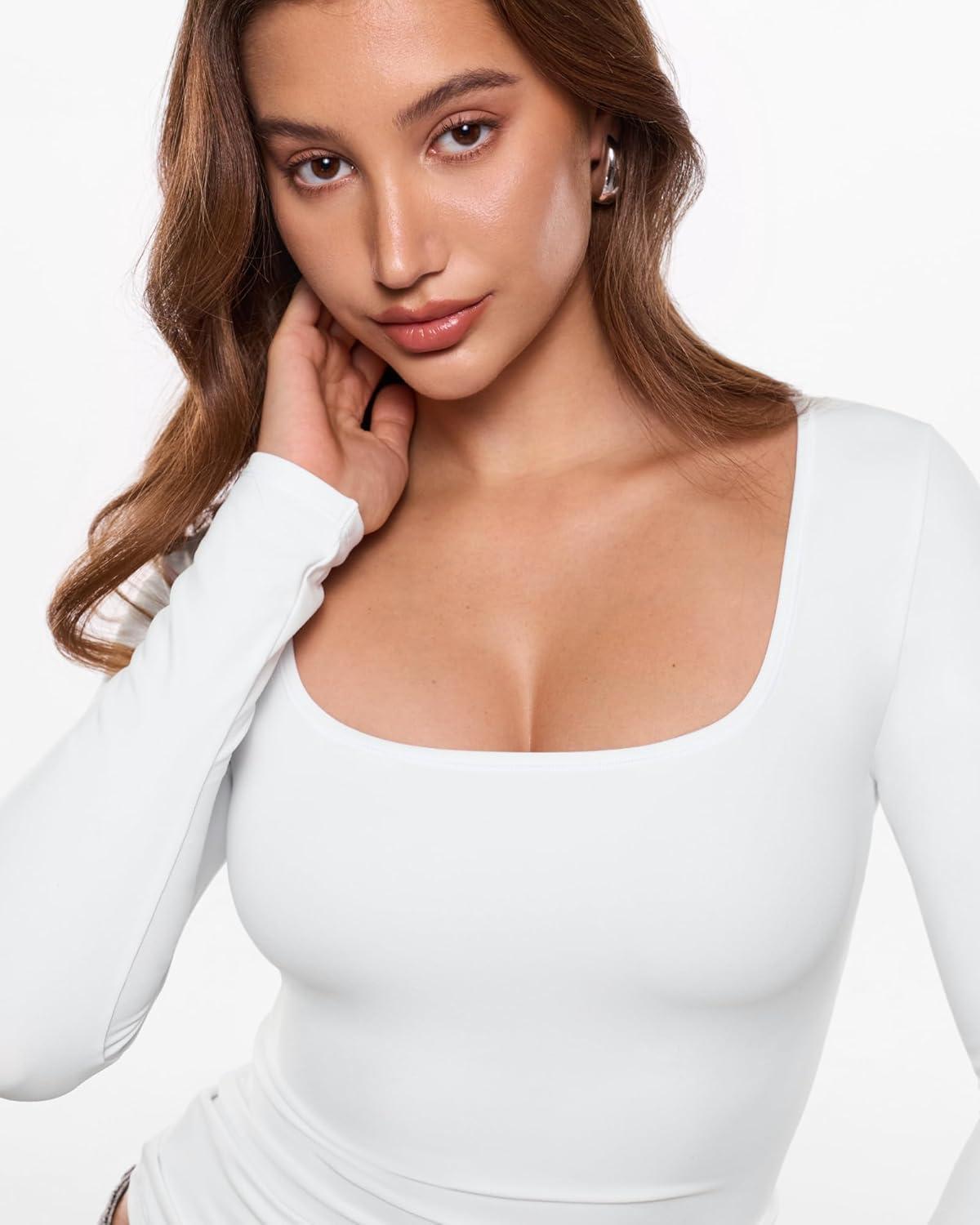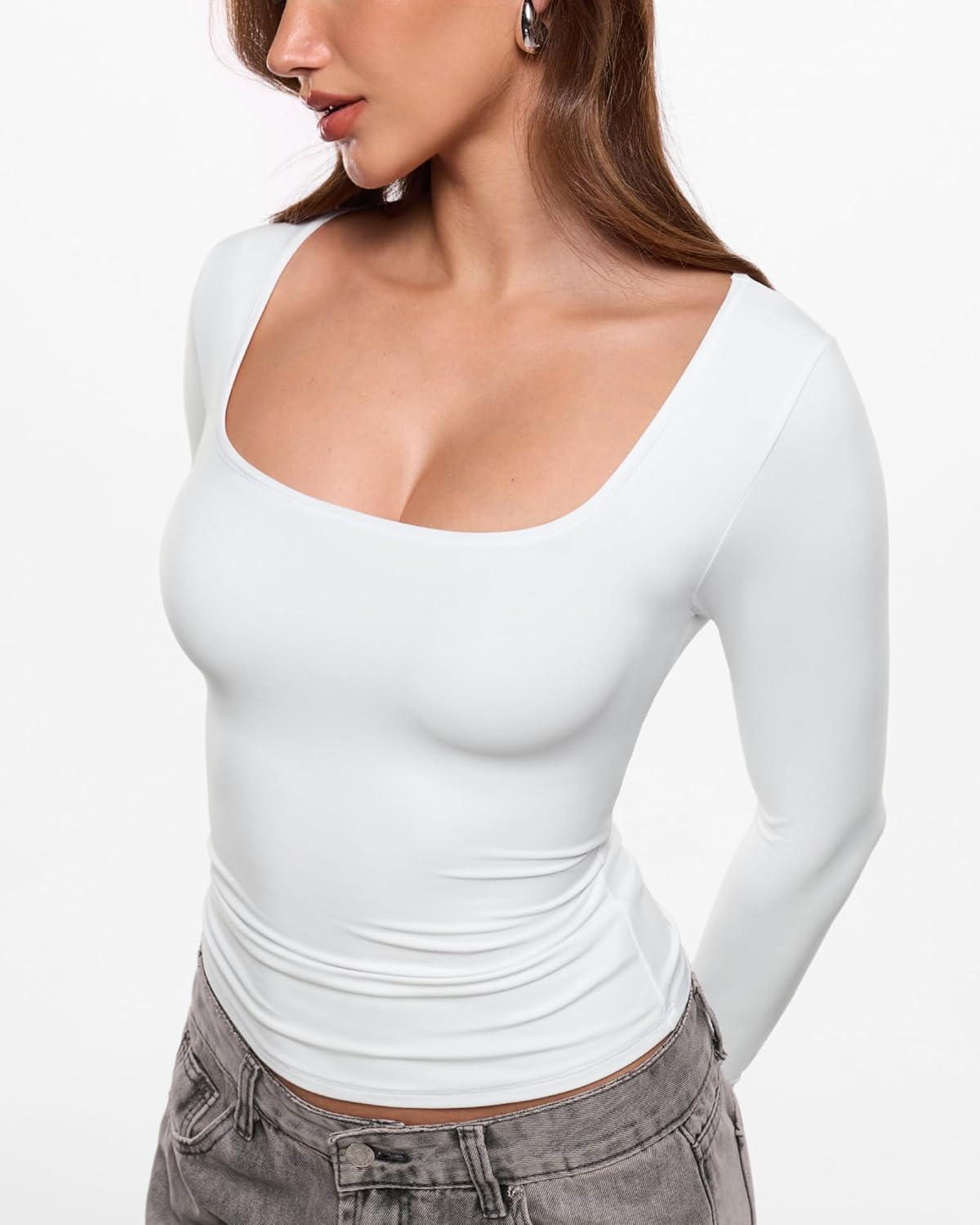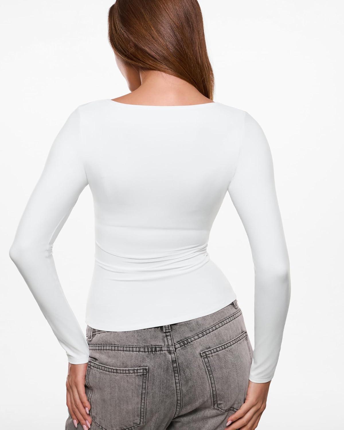 INLYRIC Women’s Airsoft Single Layer Long Sleeve T-Shirts Square Neck Basic Tees Slim Fitted Going Out Tops Trendy(Snow White)