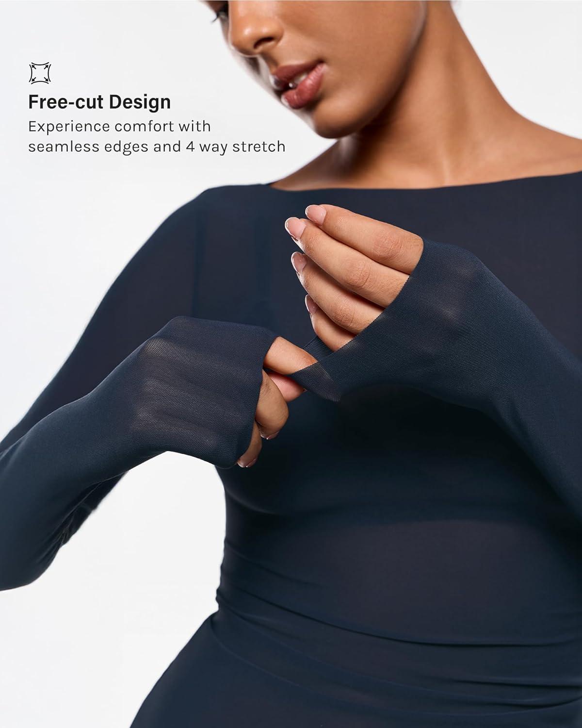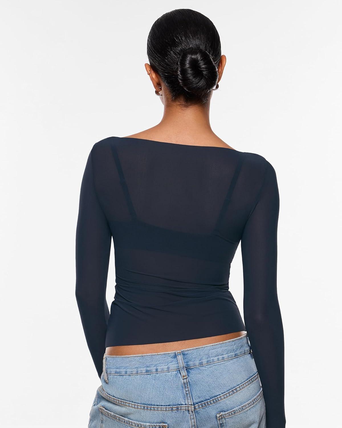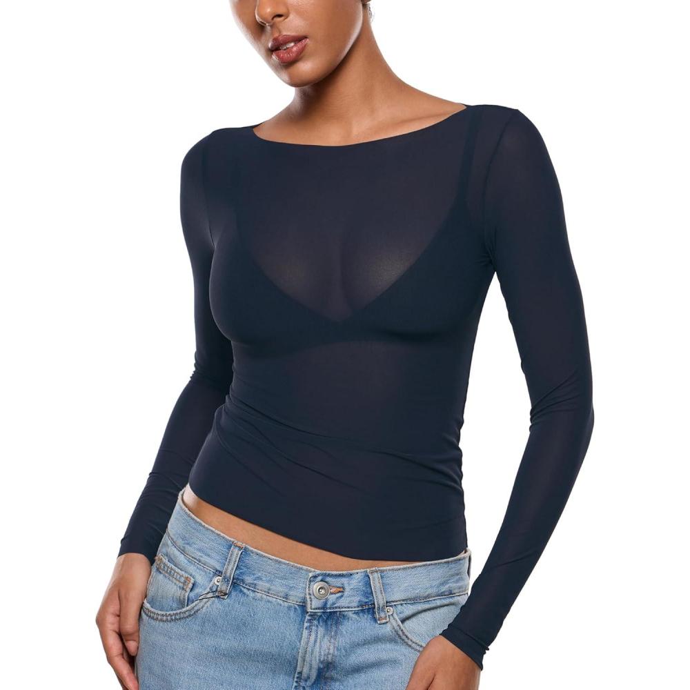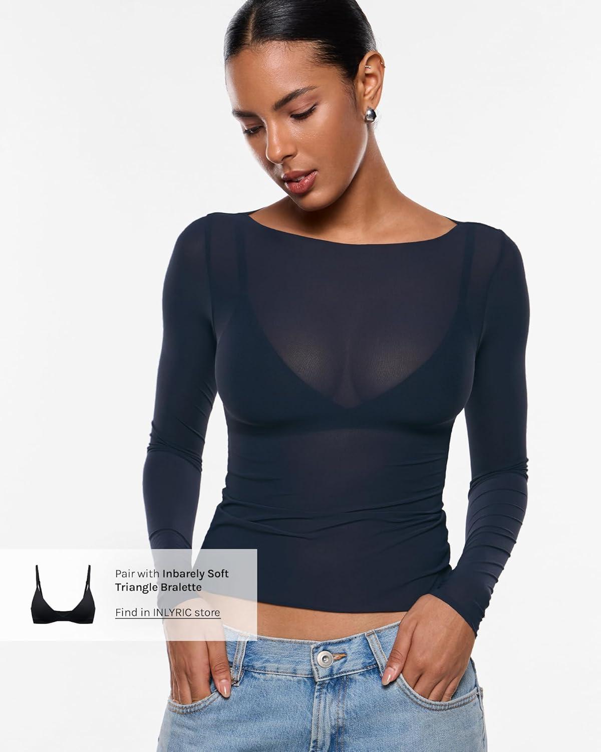 INLYRIC Women’s Cosnufy Mesh Sheer Long Sleeve Tops See Through Boat Neck Going Out Tops Trendy Sexy Shirts(Twilight Blue)