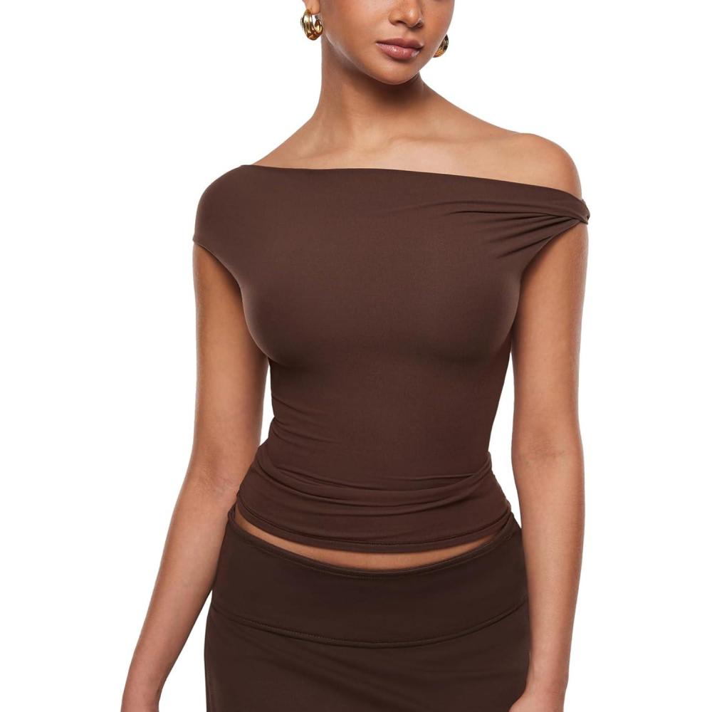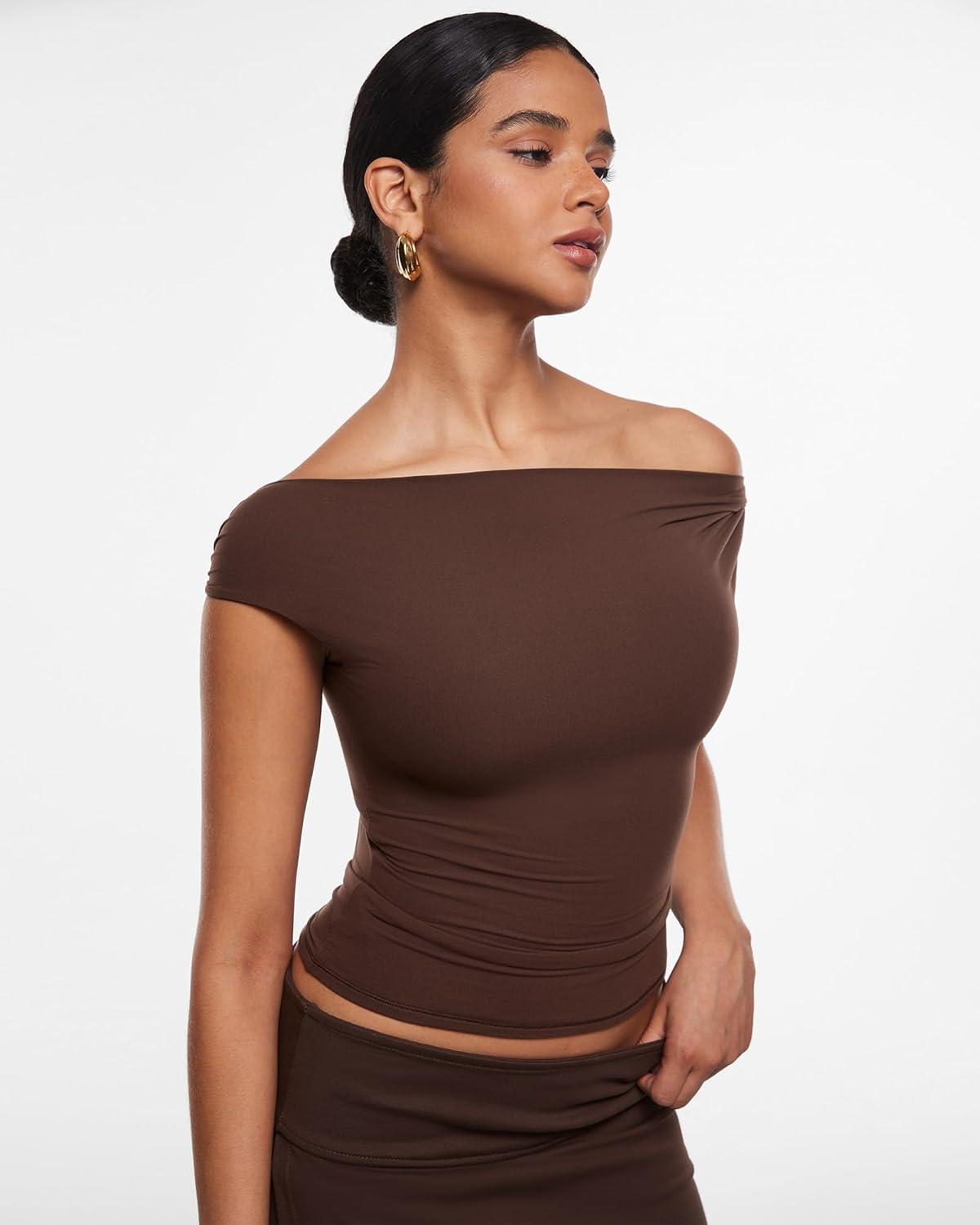 INLYRIC Women's Inbarely Soft Off The Shoulder Tops Versatile Going Out Trendy Shirts Y2K Spring Summer Outfits(Hazelnut)