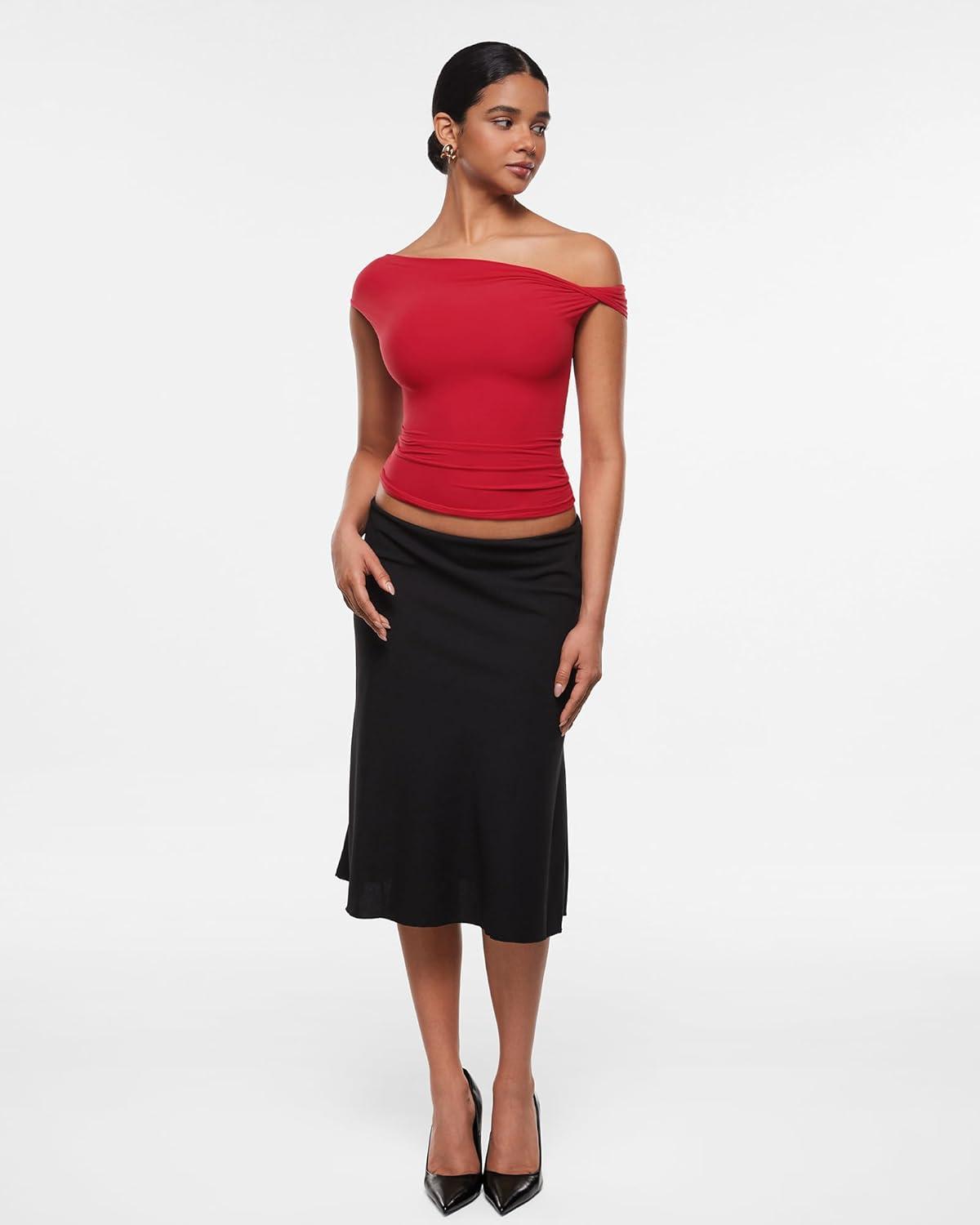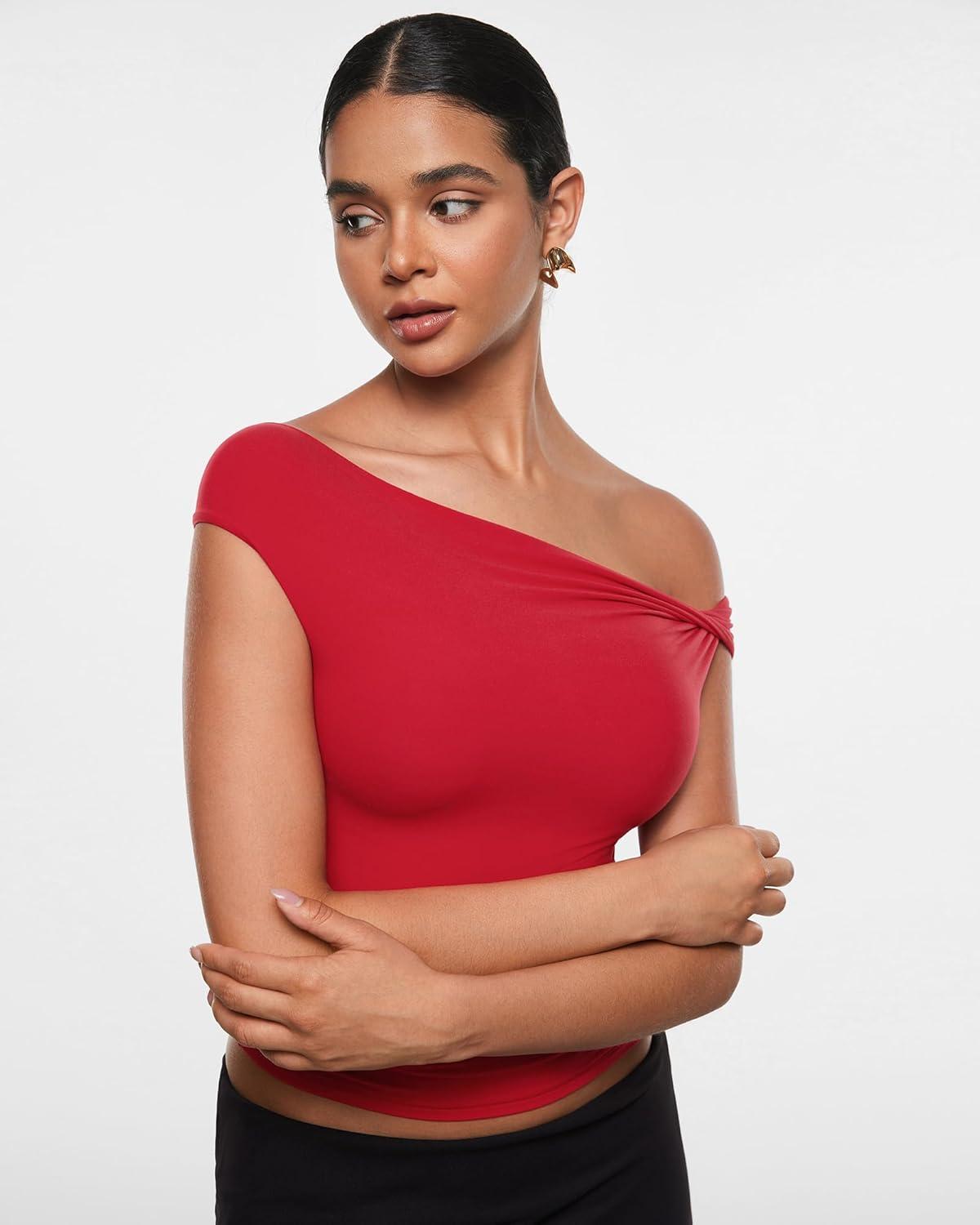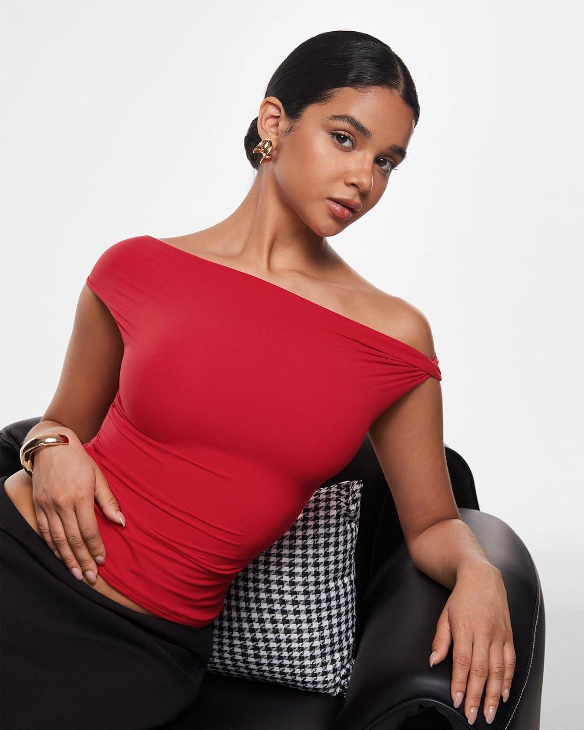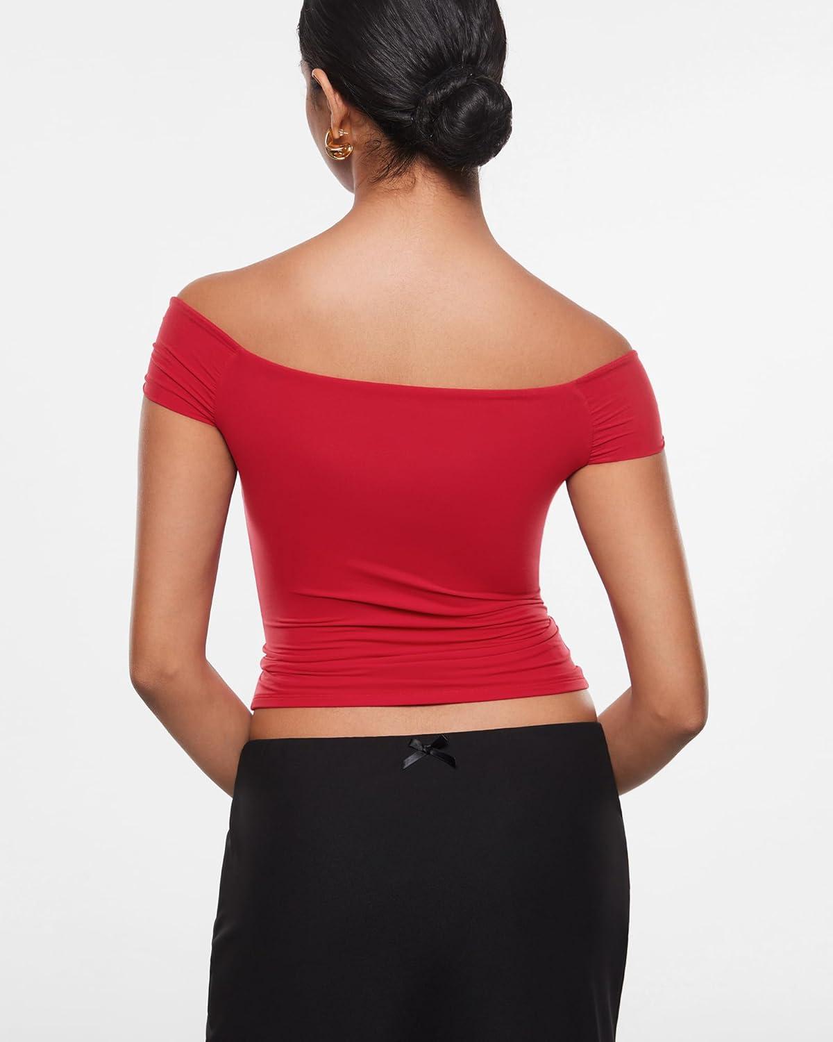INLYRIC Women's Inbarely Soft Off The Shoulder Tops Versatile Going Out Trendy Shirts Y2K Spring Summer Outfits(Lipstick Red)