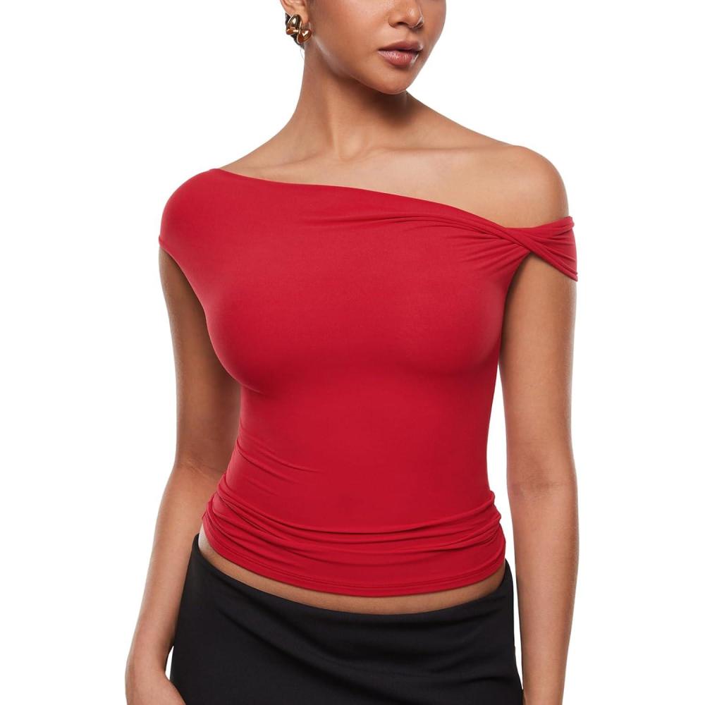 INLYRIC Women’s Inbarely Soft Off The Shoulder Tops Versatile Going Out Trendy Shirts Y2K Spring Summer Outfits(Lipstick Red)